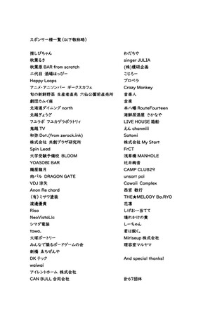 メンバーにゆかりのあるライブハウス『 浅草橋MANHOLE(東京) 』『本八幡Route Fourteen(千葉)』『LIVE HOUSE箱船(長野)』『Crazy Monkey(北海道)』をはじめ、企業や団体からの協賛を募り総勢67口のスポンサーを集めたうえでのライブ開催となった。