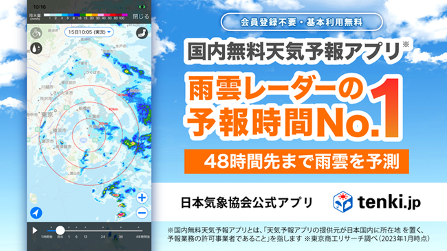 Mapion > ニュース > リリース > アプリ版「tenki.jp」のコンテンツ 「雨雲レーダー」の予報時間が48時間に