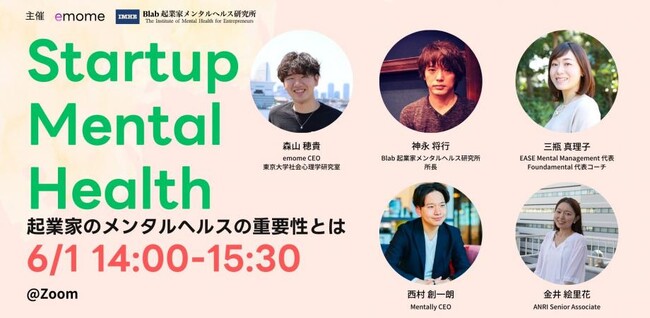 スタートアップ起業家特化のメンタルケアプログラム「Foundamental」を運営する株式会社emome(本社:東京都港区、代表取締役:森山穂貴、以下 emome)は6月1日(木)14時より、Blab起業家メンタルヘルス研究所と共催のスタートアップ起業家のメンタルヘルスに関するオンラインセミナー「Startup Mental Health」を開催します。