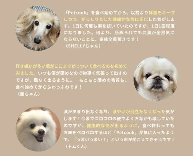 Petcookは健康に良いだけでなく、これまで食いつきが良くなかった子でも、喜んで食べるようになる程の嗜好性の良さが特徴です。Petcookを通して、愛犬にとっての食事の時間が、より健やかで幸せな時間になってくれることを願っています。