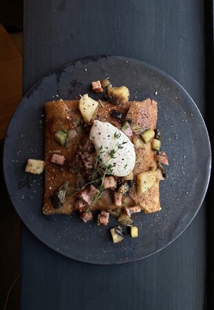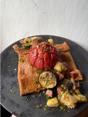 旨みの強いブラックアンガス牛のハッシュドビーフや、丸ごとトマトのガーリックグリル、夏野菜をふんだんに使ったラタトゥイユ、イベリコ豚のソーセージなど、具材をふんんだんに使ったガレットは、平面的でシンプルな軽食から、立体的で奥行きのあるメインディッシュへ様変わりしています。フランス料理のメインディッシュに飾られておかしくない、ボリューミーで味わい深い一皿です。