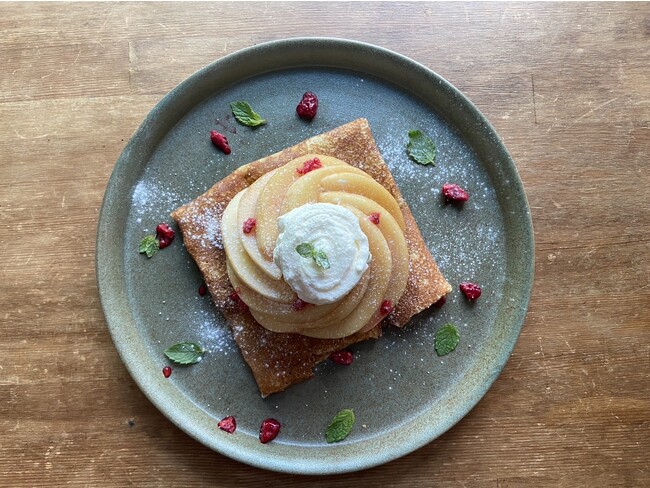 米粉を使用したもっちりとした生地の上に、隠し味の塩が効いたあまじょっぱい練乳塩バターホイップクリームをたっぷりと乗せました。四季折々の味を楽しめるのはガレットと同じ。季節のフルーツもふんだんに使った見た目も味も贅沢な一品です。