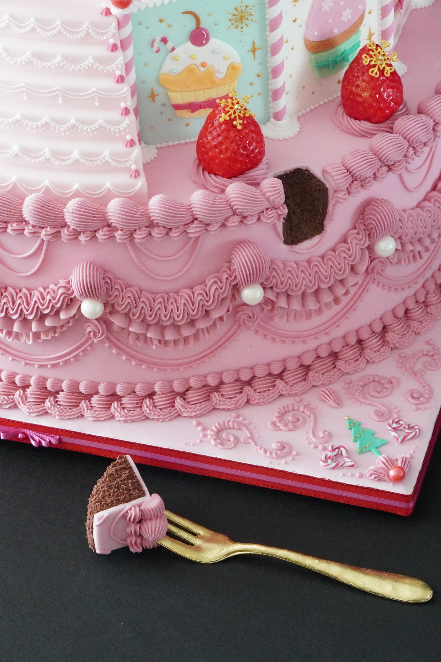 作品世界に遊び心を添える「ひとくち」高度な技術で構成された華やかなケーキ。その側面に添えられた一口サイズのケーキ片は、端正な世界観に軽やかなユーモアを添えます。さらに、そばに置かれたフォークまでもがアイシングで作られた“砂糖の造形物”。技術力と遊び心が共存する、作者らしいワンポイントです。