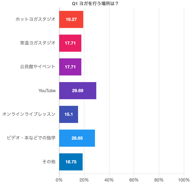 コロナ禍の影響も考えられますが、スタジオよりも約3割の人がYouTubeやビデオなど自宅での独学が多いことがわかりました。ヨガスタジオに通う層がまだ少なく、これからの需要の伸びが期待されます。