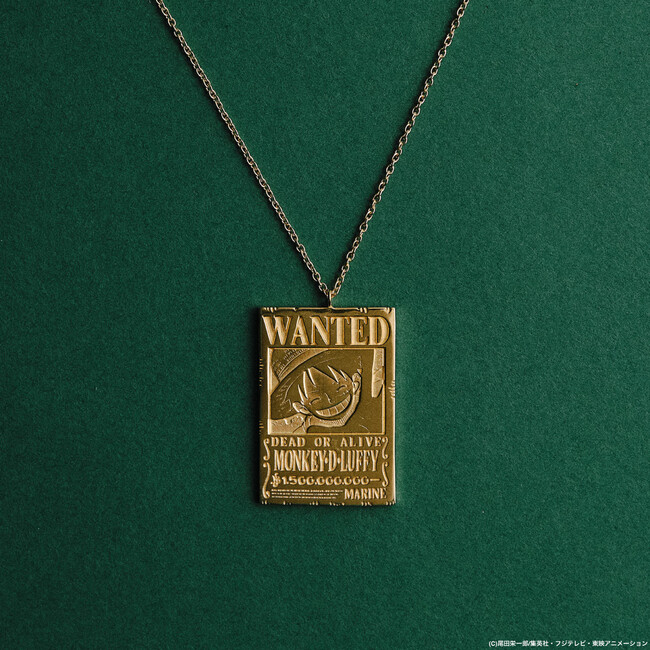 作中に登場する世界政府発行の公式手配書をモチーフにしたペンダントネックレスは、裏面の〈The M Jewelers〉のロゴと気分に合わせて使い分けれるリバーシブル仕様で、麦わらの一味とシャンクスを含む全11種展開。