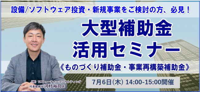 中小企業の経営層の方に向けて、最大1.5億円が補助される「事業再構築補助金」・ 最大5,000万円が補助される「ものづくり補助金」について、令和5年の最新の公募内容や採択のポイントを無料で解説するオンラインセミナーを7月6日に開催いたします。本セミナーのスピーカーは、この2つの補助金の採択支援事業に取り組み、全国平均と比較しても2倍以上、国内トップクラスの採択率を誇る、YKFC代表・河村 裕司が担当します。補助金を活用して、資金面で新たな設備投資や新規事業を進めやすくしたい企業様、ぜひご参加ください。
