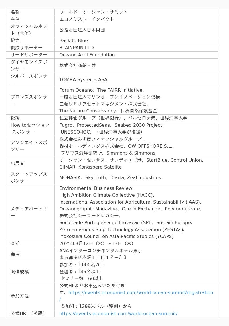 英エコノミスト・グループが立ち上げた社会変革を実現する事業のエコノミスト・インパクト(本社:ロンドン)は、オフィシャルホスト(共催)である日本財団を迎え、「第12回 ワールド・オーシャン・サミット」を2025年3月12日(水)から13日(木)まで東京・赤坂(ANAインターコンチネンタルホテル東京)にて開催します。日本での開催はこれが初めてであり、世界各国より145名以上の登壇者が一同に会します。