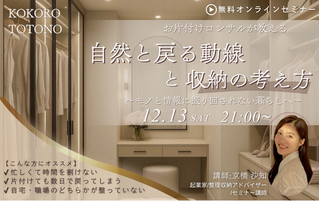 整理収納サポート・コンサル・家事代行・シッティング・インテリア提案など多角的に事業を展開する KOKORO TOTONO(東京都港区/代表:京橋沙知) は、SNSマーケティングの専門企業 株式会社BullValley(代表:青柳汰樹)、佐々木啓行氏が代表を務めるクリエイティブ支援企業・株式会社Respond(本社:東京都目黒区、代表取締役社長:佐々木啓行、以下Respond)と共同で、忙しい大人の暮らし・心・働き方を“3ヶ月で整う仕組み”に変える伴走型ライフデザイン講座を12月13日より提供開始いたします。