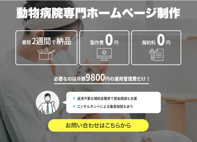 Mapion > ニュース > リリース > 【動物病院専門ホームページ制作】制作費0円・月額9,800円で保守運用までサポート!動物病院に特化したホームページ制作サービスを開始!