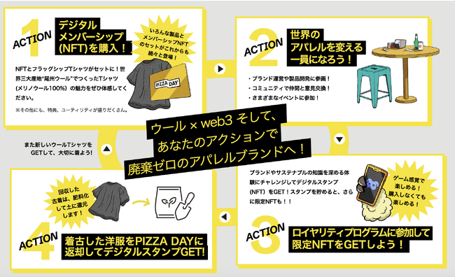 尾州ウールの上質感と機能性を最大限に活かして、着心地にこだわった美しいデザインが特徴のメリノウールTシャツと、これまでにないアパレル体験を創り出すメンバーシップNFTのセットを23年10月16日よりPIZZA DAYのwebサイト(https://www.pizzaday.world/)で限定300セット販売します。
