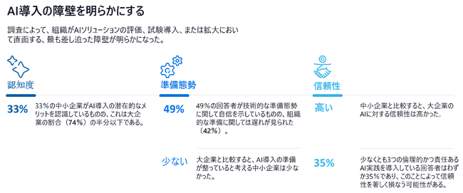 - 中小企業での認識の遅れ - 大企業では74%がAIのメリットを強く認識している一方で中小企業では33%にとどまる。
