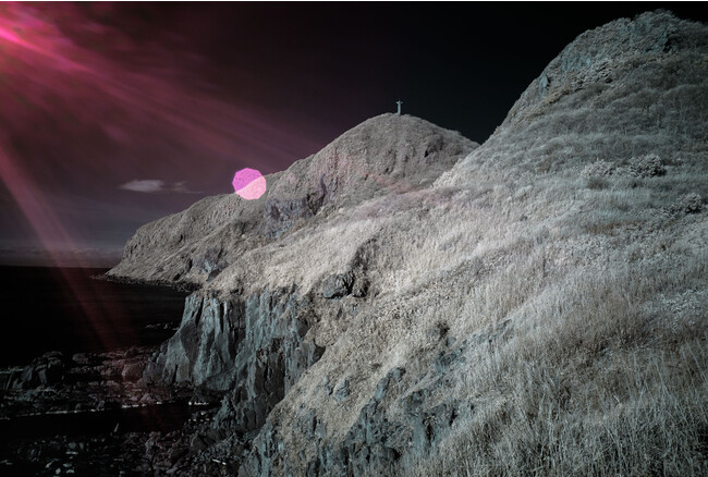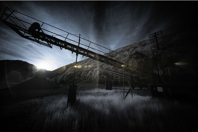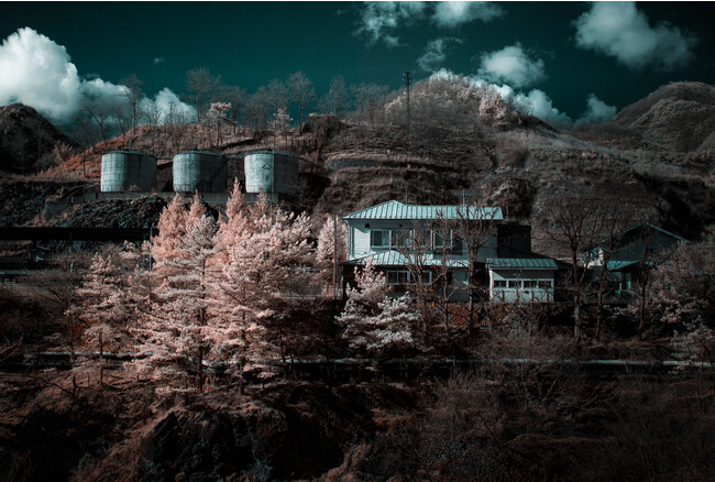 特殊な撮影装置で赤外線だけで照らされた世界を捉え、さらに独自の画像処理によって私たちが認識できるイメージへと変換します。異界のようなその光景は、擬似的な世界でも空想の世界でもなく、まぎれもなく私たちの目の前に広がるひとつの有り様なのです。
