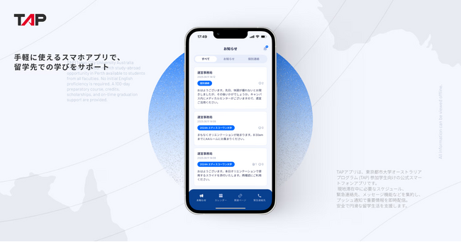 東京都市大学の留学支援アプリ「TAPアプリ」を開発し、学生約360名が利用開始。メッセージ機能、カレンダー機能、資料閲覧機能を搭載し、安全で有意義な留学生活をサポート。