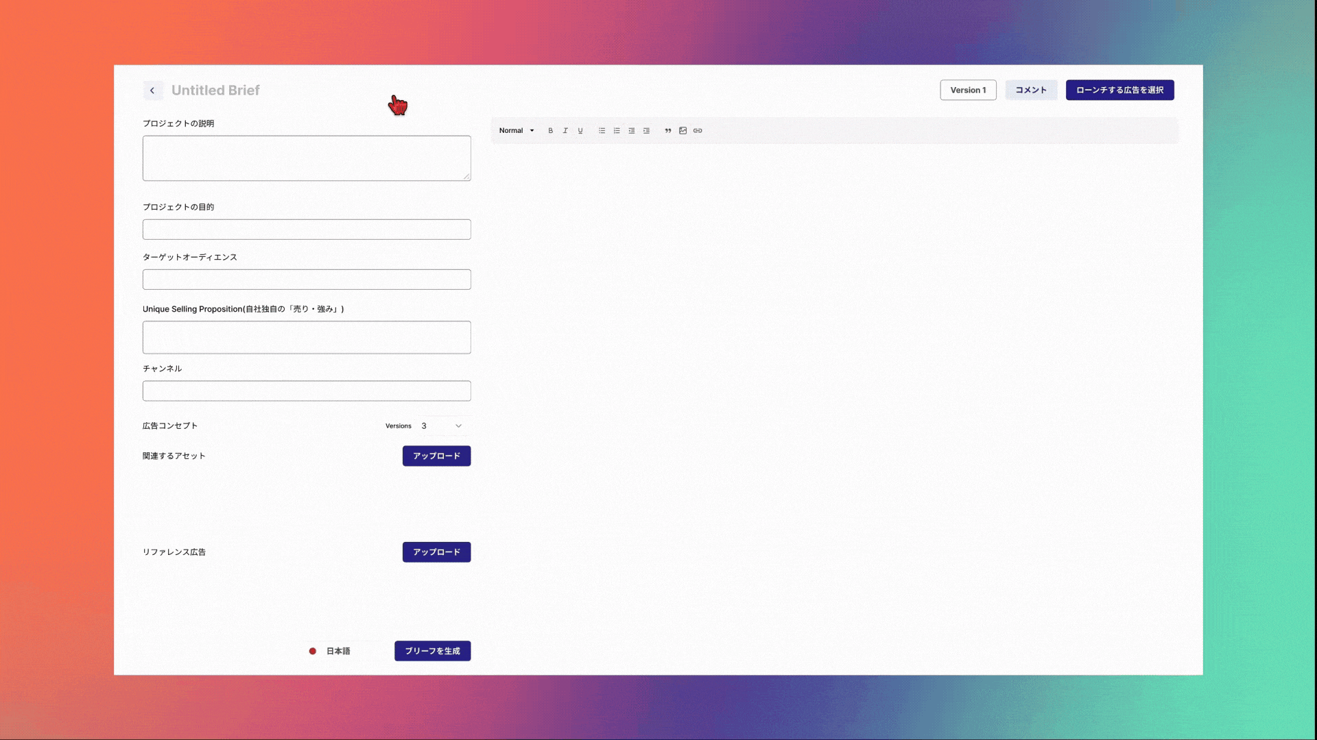- リファレンス広告(任意) - デザインの参考にしたい広告クリエイティブを複数セットすることで、それらの広告をインスピレーション素材として参照し、新たな広告デザインを生成する