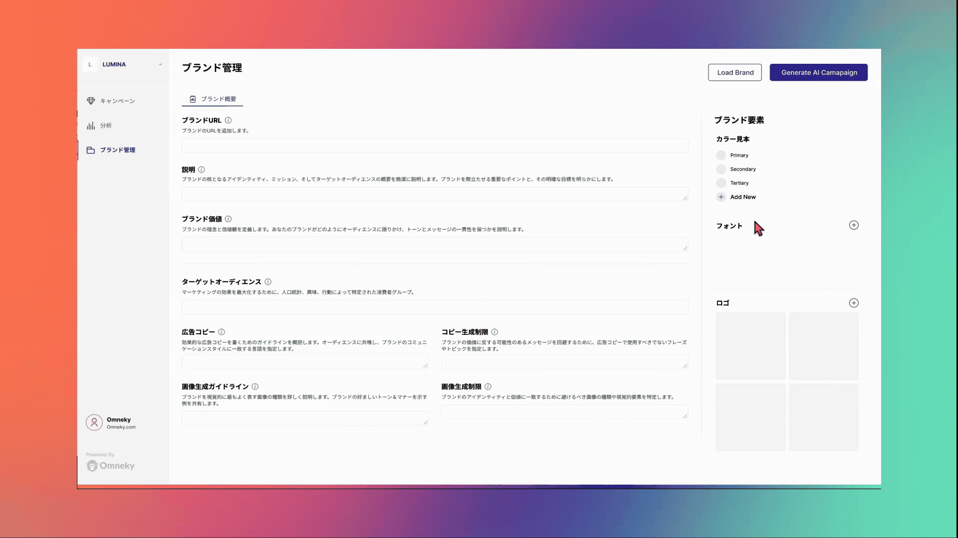 商品/サービスサイトのURLやブランドガイドラインを入稿することでブランド情報をダッシュボード内で一元管理。これらの情報が広告の自動生成の基礎として活用される。