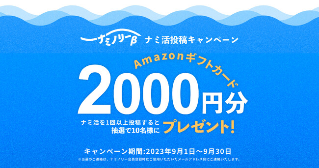 サーフポイント情報やナミノリを楽しんだ活動の記録をユーザー間で共有できる、 サーフィンデータベース「ナミノリー β版」は、2023年9月1日(金)~2023年9月30日(土)までの間、ナミ活投稿キャンペーンを実施いたします。
