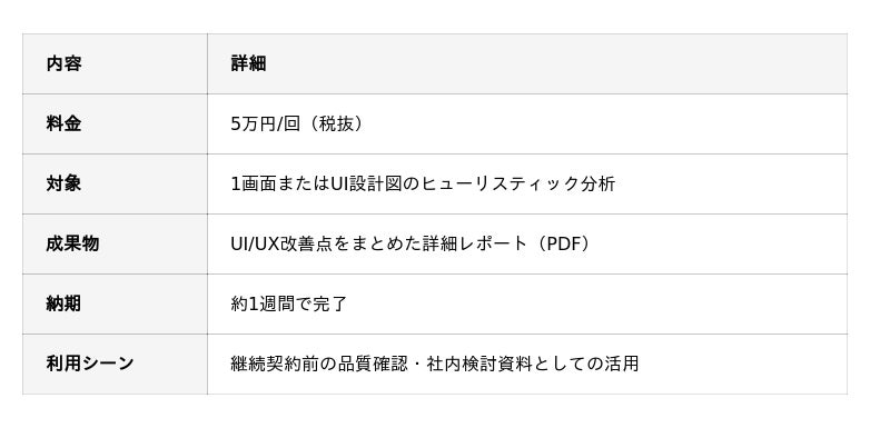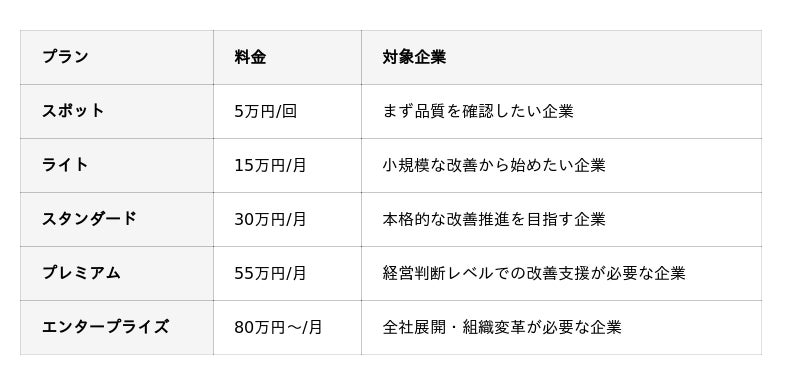 - 料金プラン:5万円/回(スポット:単発型)、月額15万円~(その他プラン:伴走型)