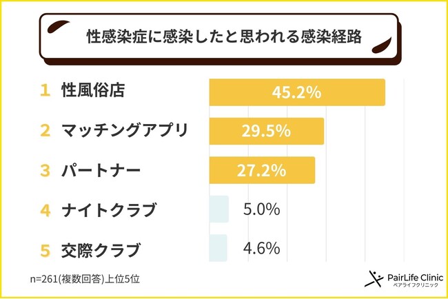性感染症内科ペアライフクリニックが261人に意識調査を実施。感染経路は性風俗店が最多、マッチングアプリも約3割。半数以上がパートナーと話したことがなく、16.9%は感染時も伝えられないと回答。