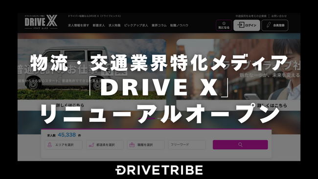 ドライバーに特化した人材サービスを行う株式会社ドライブトライブ(本社:東京都渋谷区、代表:鷹野 雄太、以下当社)は、ドライバーHRメディア「DRIVE X(ドライブエックス)」を全面リニューアルオープンしたことをお知らせいたします。これまで求人情報を中心に展開してきた「DRIVE X」を、物流・交通業界に特化した“求人×情報”のハイブリッドメディアへ刷新し、ドライバーや求職者だけでなく、企業や業界関係者にとっても価値のある情報プラットフォームを目指します。https://drive-x.jp/