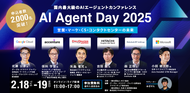 生成AI技術を活用したAIエージェントによる社会実装を推進し、顧客体験(CX)の変革を目指す一般社団法人AICX(AI Customer Experience)協会(東京都、代表理事:小栗伸、小澤健祐、以下、AICX協会)は、国内初のAIエージェントをテーマにしたオンラインカンファレンス「AI Agent Day 2025」の申込者が2,000名を突破したことをお知らせします。