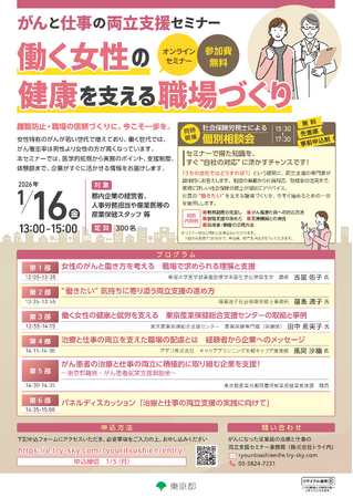 東京都は、「東京都がん対策推進計画」に基づき、がん患者の就労支援の推進に取り組んでいます。この度、企業経営者や人事労務担当者等を対象に、女性のがんと仕事の両立支援をテーマとしたオンラインセミナーを開催します。