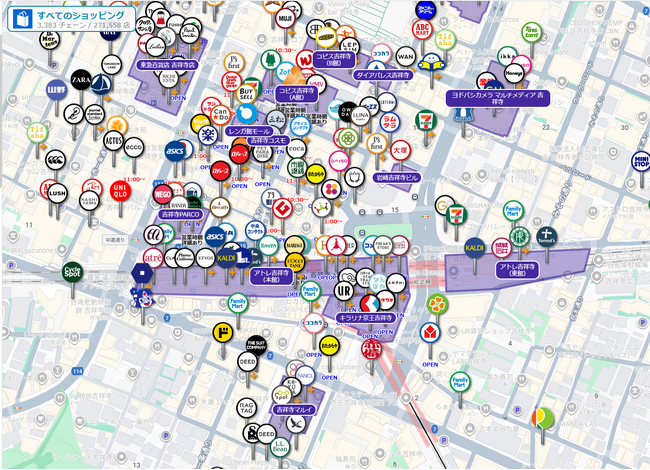 この新機能では、全国の主要な2766カ所(発表時点)の商業施設の建物ポリゴン(ジオフェンス)をマップ上に表示し、中央に施設名のボタンを表示します。この施設名ボタンをクリックすると、別ウィンドウが開き、商業施設内のテナント店舗がフロアごとに一覧表示されます。