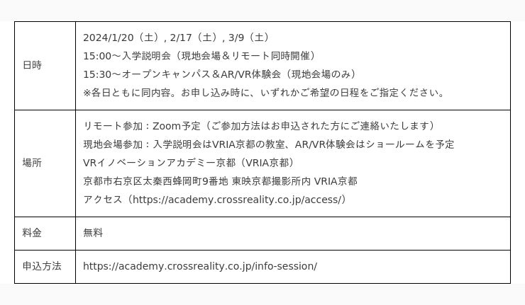 ※上記日程のご都合が悪い方は、オンライン個別相談会(https://academy.crossreality.co.jp/counseling/)にて事前予約制で入学説明や見学を受け付けておりますのでお気軽にご利用ください。