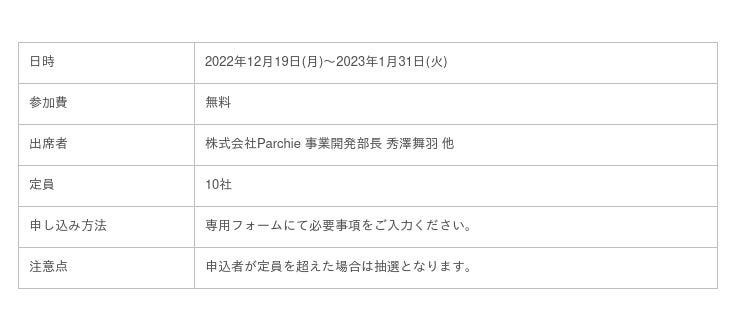 株式会社PARCHIE(本社:渋谷区、代表取締役:神崎 陸、以下PARCHIE)は人気ブランドコスメがお得なプライスで買える、クローズドECサービス「Pantrii(パントリー)」は年末年始キャンペーンとして出店パートナー事業者様を対象にオンライン個別相談会を実施いたします。