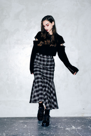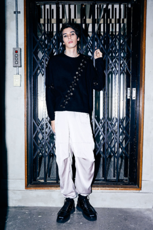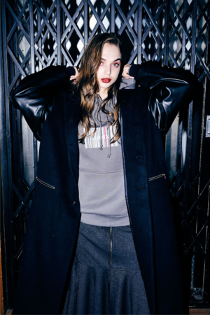 レザーとイタリア産のリサイクルウールを組み合わせたアウターやライダースライクなデザインを施したフレアスカート、レザー紐のレースアップとハトメデザインでエッジを効かせたラムウール混のニットなど、エッジの効いたデザインでありながら、生地感や着心地にもこだわった日本製の上質なアイテムを中心に展開いたします。