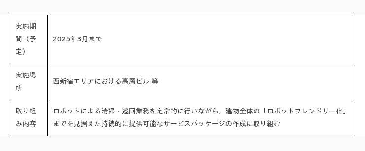 3社は、清掃や警備等の管理業務をDX化する際の事業面や運用面等の課題を抽出し、近年発展し続ける最新のIT・IoT技術を活用したロボットによる管理サービスの持続的な提供を可能とすることで、西新宿エリアにおける高層ビル群から「管理業務のロボットフレンドリー化」を目指してまいります。