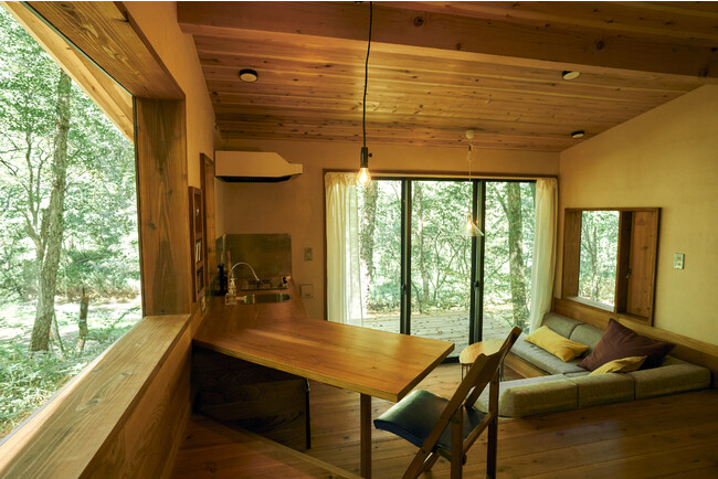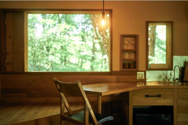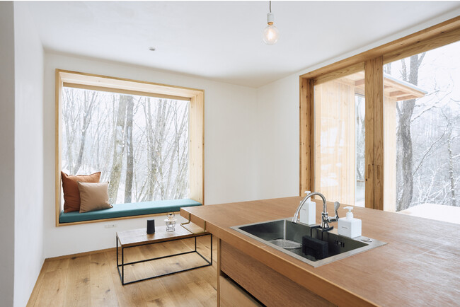 20平方メートル ワンルームの小さな空間ながらも、寝室、キッチン、リビングの機能を分けてゆったりと過ごせる設計になっています。デッキにつづく大きな窓からは川が見下ろせ、小窓をあければせせらぎや小鳥の鳴き声が聞こえてきます。季節や時間帯によって移り変わる森の景色とともに1日を過ごすことができます。
