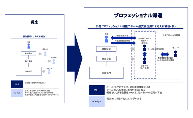 その中で近年支援形態の1つとして実例、実績が多くなってきているのが、企業において成長や再生実現を目指すにあたり、機能補完を必要としている経営者人材や経営幹部人材、また経営企画人材や主要業務の責任者人材を複数名チームとして派遣し、経営を直接的に担う「プロ経営者・チーム派遣サービス」です。