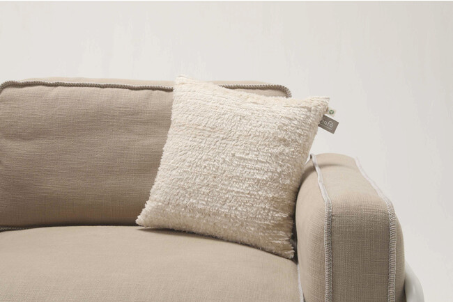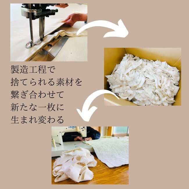 SaFoの 「Use it all (使い切る)」のコンセプトで生まれた生地は、製造過程で破棄されるオーガニックコットン生地の「生地の耳」(布生地の両端部分)を縫い合わせたもの。廃棄される生地端は、布生地の約6%にあたり、年間580kgにものぼります。その生地端を、一枚一枚丁寧に裁断し、縫い重ねていくことで新たな生地として生まれました。