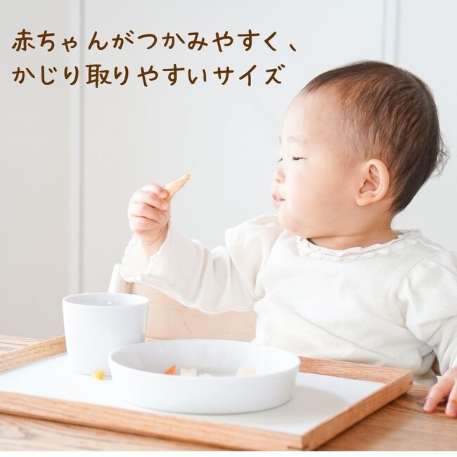 小さな手でつかみやすい形・噛みやすい固さ・飲み込みやすい水分量にこだわりました。