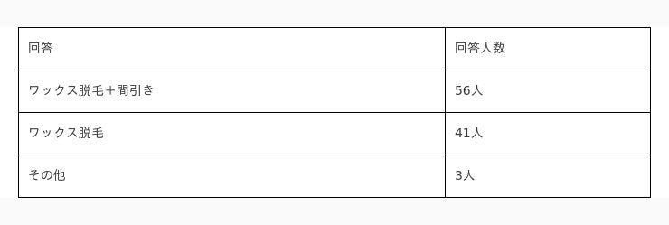 ワックス脱毛+間引きは、多くの眉毛サロンが採用している施術方法です。そのため、施術を受けている人が多いという結果に。また、ワックス脱毛のみというサロンもあることから、単独での施術も半数近くいるということが分かりました。その他では、シェーバー処理での施術を受けたとの回答もありました。