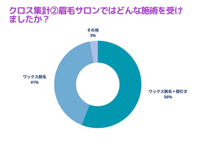 眉毛サロンの施術は「ワックス脱毛+間引き(56%)」、「ワックス脱毛(41%)」を受けている人が多いと分かりました。