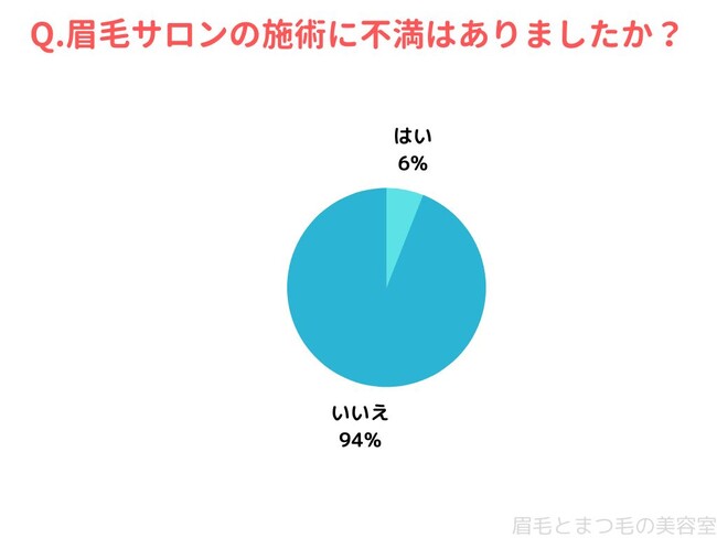 眉毛サロンの施術自体に不満があるかという問いに「いいえ」と答えた人が94%、「はい」と答えた人が6%となりました。