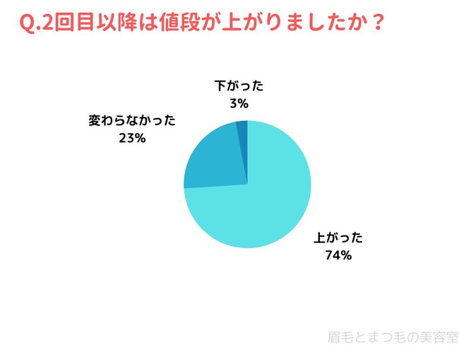 眉毛サロンの2回目以降の値段は「上がった(74%)」が過半数を超えています。「変わらなかった(23%)」「下がった(3%)」というサロンは少数派ということが分かります。