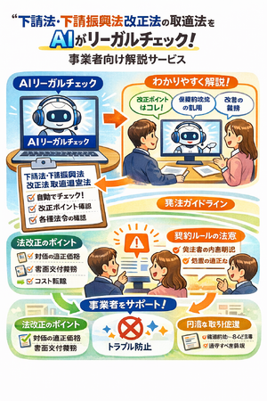2026年1月施行に向けてカウントダウン。今すぐ準備すべき「支払条件の見直し」と「社内フロー整備」をAIが強力バックアップ。旧下請法からの変更点を網羅。「3つの禁止事項」をAIが厳しくチェック。