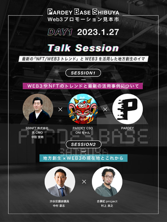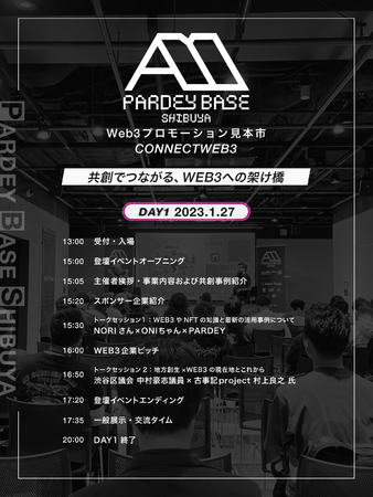 Day1では渋谷区議会議員:中村豪志氏や、古事記project:村上良之氏、SBINFT株式会社 元CMO:中田宜明氏やPARDEY CSOのONIちゃんをお招きし、WEB3の最新トレンドや取り組みについてお話いただきます。