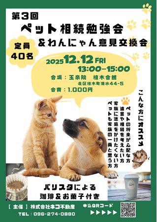 熊本市のネコ可物件専門店 [株式会社ネコ不動産](本社:熊本県熊本市南区平田1-14-19 草野ビル305 代表取締役:鶴上万里生)は、ペット相続勉強会&わんにゃん交流会を2025年12月12日(金)に玉泉院植木会館で開催します。このイベントは、ペット相続をテーマに、ペットを通じて改めて相続について考えを深める目的があります。私たちは、飼主が亡くなった後に残されるペットへの備えを一緒に考える機会を設けて、新たな犬好き・猫好きのコミュニティの形成と交流の促進を目指しています。