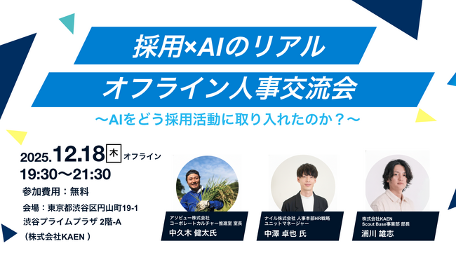 忙しい人事のためのAIスカウトサービス「Scout Base(スカウトベース)」を提供する株式会社KAEN(本社:東京都渋谷区、代表取締役:川田勇輝、以下「当社」)は、2025年12月18日(木)に、採用担当者を対象としたオフライン交流会「採用×AIのリアル ~AIをどう採用活動に取り入れたのか?~」を東京・渋谷オフィスにて開催いたします。 本イベントは、急速に普及するAIツールや採用DXツールについて、実際に現場で運用している担当者が集まり、ツールの導入効果や直面した課題、失敗談などを「本音」で語り合うためのミートアップです。