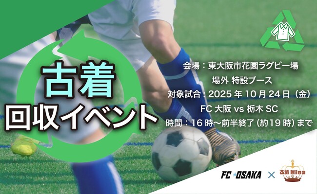 「業界唯一。仕入れゼロ円だから、不安もゼロ。私の暮らしに、ちょっとのプラスを。」をコンセプトに掲げる古着無在庫副業サービス「古着KING」を運営する株式会社SIMPS JAPAN(本社:大阪府八尾市、代表取締役:松木 慎也、以下当社)は、この度、2025年10月24日(金)に開催されるFC大阪のホームゲーム会場(vs 栃木SC)において、環境保全と資源循環の促進を目的とした古着回収イベントを実施いたします。