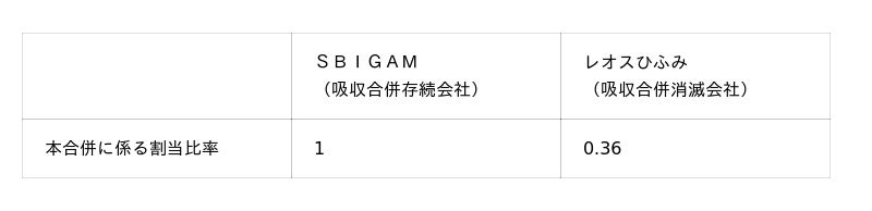 レオスひふみの株式1株に対して、SBIGAMの株式0.36株を割当て交付します。ただし、本合併の効力発生日直前(以下「基準時」といいます。)にレオスひふみが保有する自己株式5,968,700株(2025年9月30日現在)については、本合併による株式の割当ては行いません。
