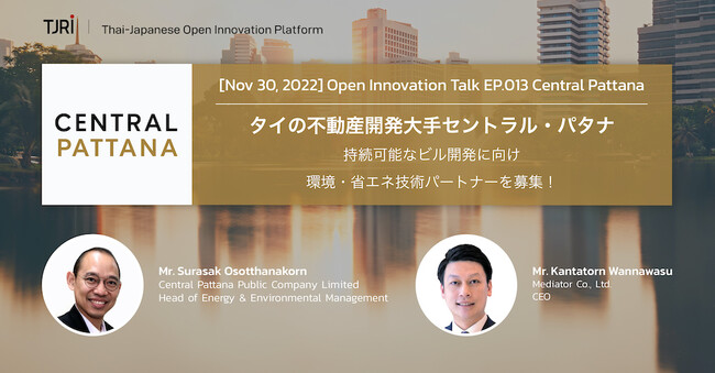 日本とタイをビジネスでつなぐB2Bマッチングプラットフォーム「TJRI」を運営するMediator Co., Ltd.(本社:タイ王国バンコク、代表取締役社長:ガンタトーン・ワンナワス)は、タイの不動産開発大手Central Pattana Public Company Limited(セントラル・パタナ:以下、CPN)をゲストに迎え、11月30日(水)日本時間12:30よりオンラインにて「Open Innovation Talk」を開催します。本プログラムでは、CPNが募集する技術パートナーの詳細について発表します。タイや東南アジアへのビジネス進出を目指す企業は絶好の機会となります。ぜひご参加ください。