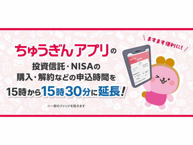 中国銀行(岡山市 頭取 加藤 貞則)では、12月14日(日)から、ちゅうぎんアプリで投資信託・NISA の「当日の購入・解約(取消を含みます)」を申込むことができる時間 を延長します。