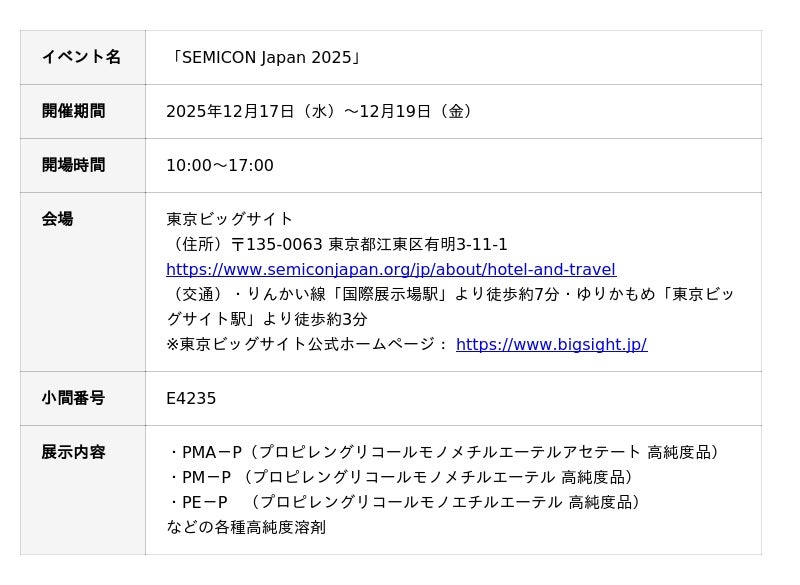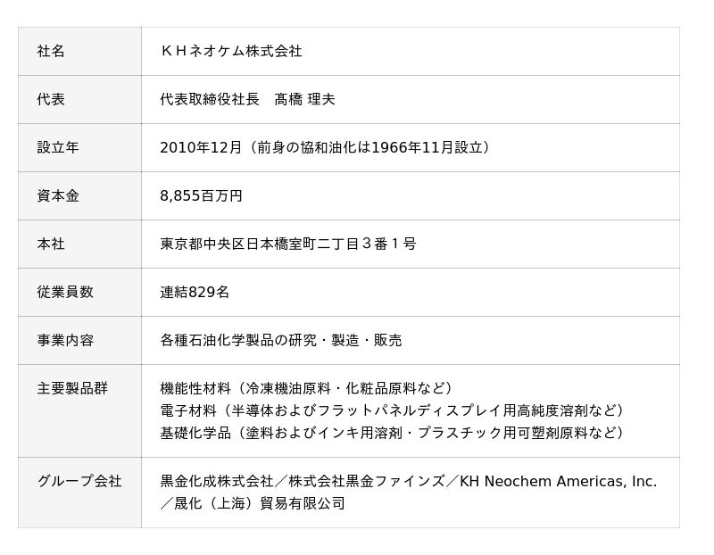 KHネオケム株式会社(本社:東京都中央区、代表取締役社長:高橋 理夫)は、2025年12月17日(水)から12月19日(金)まで、東京ビッグサイトで開催される「SEMICON Japan 2025※1」に、中部パビリオン内で共同出展します。