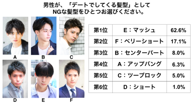 女性に「男性がデートでしてくるNGな髪型」を選んでもらったところ、「マッシュ」が1位となりました。韓流ブームから続いて男性の髪型としてトレンドにもなっておりましたが、デートにはしてきてほしくないという女性が多くいる結果となりました。