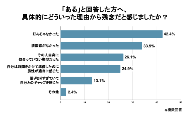 また、デートの時に相手の髪型が残念だと感じた理由を尋ねたところ「好みじゃなかった」と答える女性が最も多く、次に多かったのが「清潔感がなかった」という回答でした。