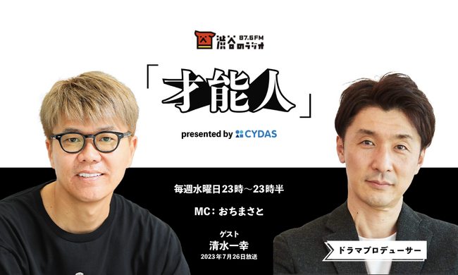 天才プロデューサー・おちまさとのラジオ番組『才能人』(渋谷のラジオ 87.6MHz 毎週水曜日 午後11時~)。7月26日放送のゲストは、『のだめカンタービレ』、『CHANGE』をはじめ、数々の人気テレビドラマをプロデュースしてきた、敏腕ドラマプロデューサーの清水一幸。ドラマプロデューサーを志したきっかけ、一番才能を感じたという俳優の収録裏話、おちまさとをドラマに起用するなら何役にするのかなど、ざまざまな話題が繰り広げられます。